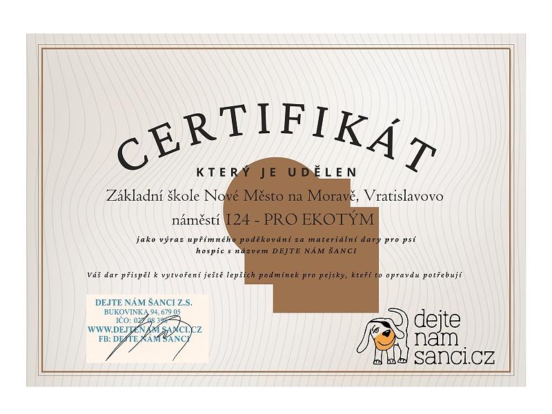Na jedné ze schůzek Ekotýmu si jednohlasně odsouhlasili účast na pomoci psímu hospici v Bukovince. A tak se nám sešla během jednoho týdne krásná – asi třicetikilová – sbírka dobrot pro pejsky, kteří neměli to štěstí na správné majitele. O to víc si ceníme, že našli společný domov.