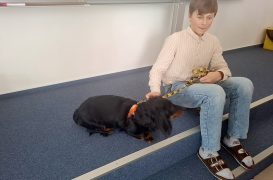 A jak jinak si přiblížit chov domácích mazlíčků než reálnými ukázkami a povídáním o vlastních zkušenostech? A tak se nám v hodině sešli především pejskaři. Nejprve k nám zavítal holandský kachní pes (kooikerhondje) jménem Kevin. To bylo oboustranné radosti 😊! Děti se dozvěděly, jaké nároky toto plemeno na chov má, jaké jsou jeho charakterové vlastnosti nebo třeba čím a jak často pejska krmit. Následovala návštěva dvouletého samojeda Larryho. Takový trochu lední medvěd, ale neskutečně přátelský a hravý. Nakonec jsme se ledacos dozvěděli i o jezevčíku Míšovi.