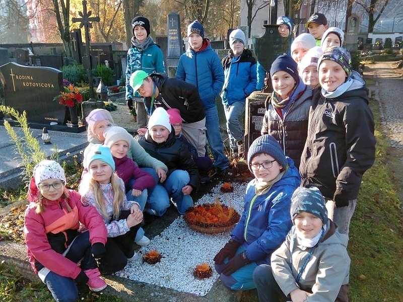 Po úvodní teoretické části zmíněného výukového programu následovala část praktická – tvorba dušičkové výzdoby. Žáci vytvořili netradiční výzdobu z borovicových šišek doplněnou oranžovou dekorací, na kterou finančně přispívá město Nové Město na Moravě. Na závěr se vydali na hřbitov k hrobu spisovatele Petra Křičky, který již druhým rokem žáci naší školy opečovávají. Symbolicky spojili radost z tvoření s úctou k těm, kteří tu byli před námi.