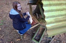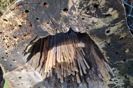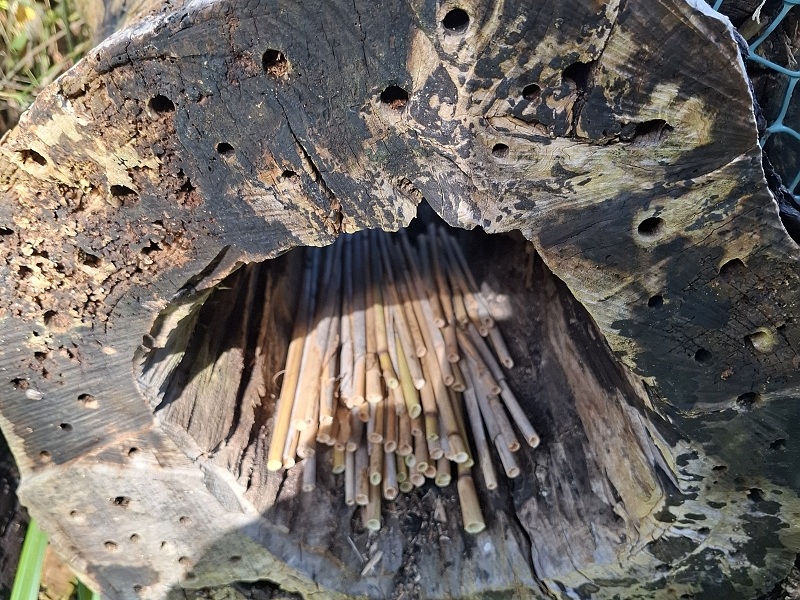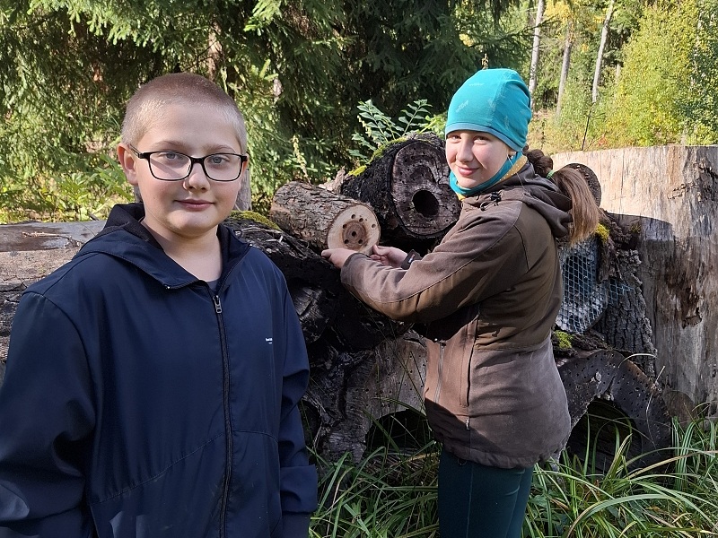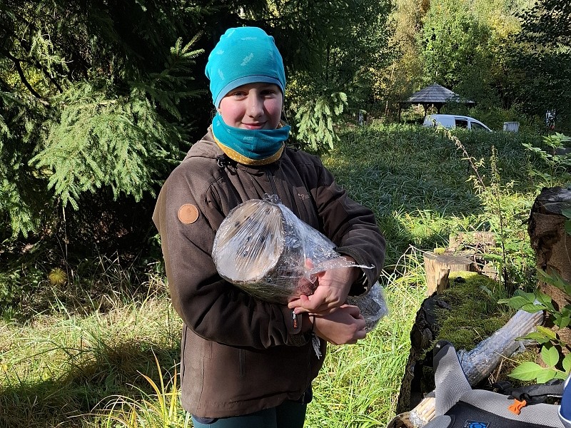 Zamířili jsme si to – jak jinak – k Hrnečnici, kde nás čekala obnova hmyzích hotýlků. Bylo potřeba doplnit sesychající se materiál, a tak jsme donesli šišky, rákosí a nový špalík plný děr a dírek pro případné hmyzí hosty. Tímto děkuji především Eleně Markové, která statečně donesla asi pětikilový špalek v batohu na zádech až na místo :o)))